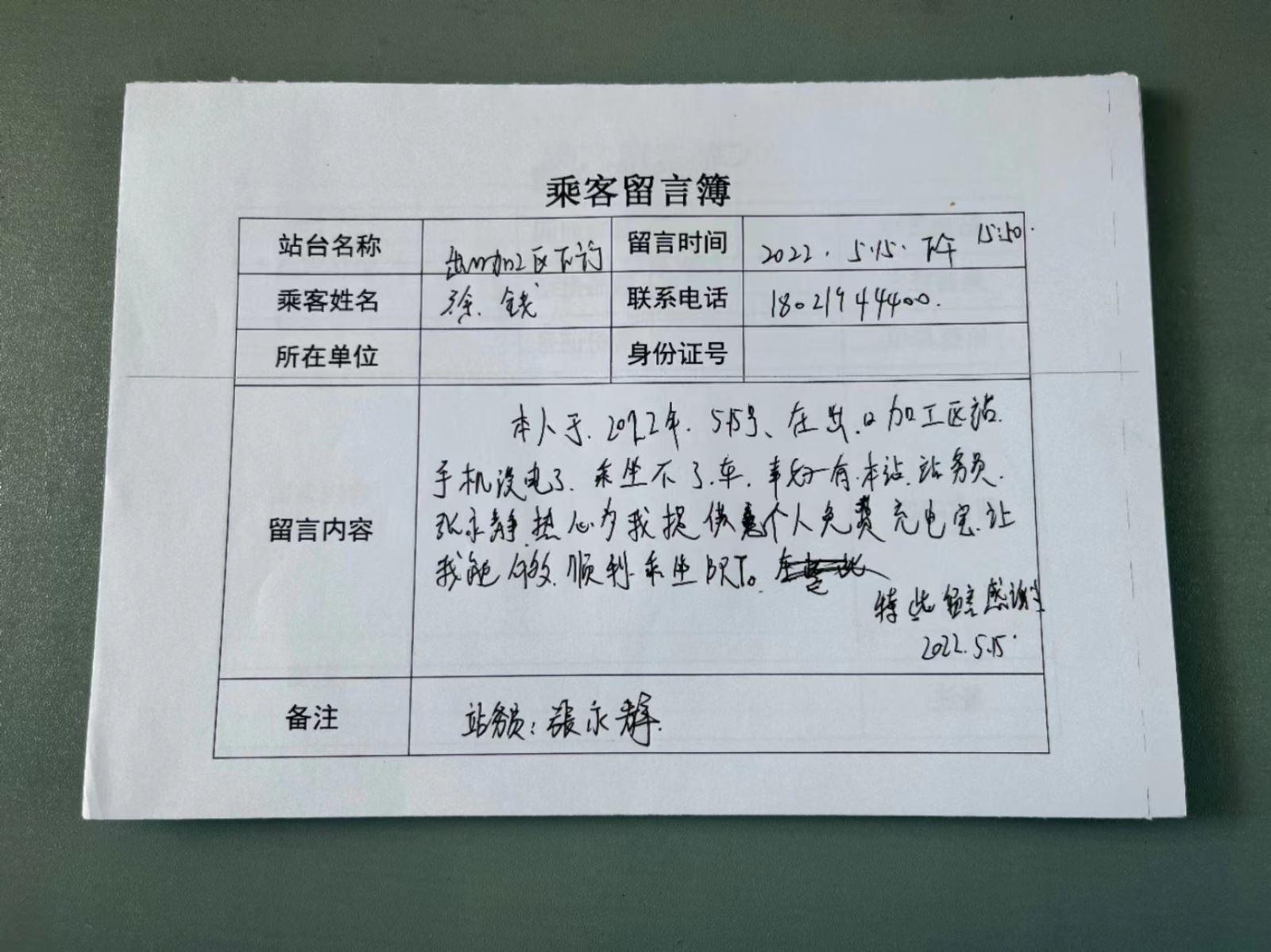 5月15日下午,出口加工區(qū)站當(dāng)班站務(wù)員張永靜,往常一樣在閘機(jī)處開(kāi)展疫情防控工作。大約在三點(diǎn)左右,有一位年輕的男乘客進(jìn)站,他不是立即出示健康碼或者買(mǎi)票,而是在站臺(tái)的坡道口來(lái)回徘徊,看起來(lái)心情很煩躁。張永靜仔細(xì)地觀察了一會(huì)兒,主動(dòng)上前詢(xún)問(wèn):“請(qǐng)問(wèn)有什么需要幫助的嗎?”男乘客著急的的說(shuō):“我要到新浦去,可是我的手機(jī)沒(méi)電關(guān)機(jī)了,身上又沒(méi)帶現(xiàn)金,不知道該怎么辦了!”張永靜說(shuō):“師傅,不要著急,我這有充電寶,也有充電線(xiàn),要不你充試試,如果實(shí)在不能充的話(huà),我給你兩塊錢(qián)坐車(chē)。”乘客聽(tīng)后非常感激。說(shuō)完,張永靜把自己的充電寶拿給了乘客,不一會(huì)乘客把手機(jī)充上了電。乘客在進(jìn)站之后,還不停的說(shuō):“謝謝,事情雖然小,但是對(duì)我來(lái)說(shuō)得到了很大的幫助。”乘客說(shuō)完后留下了感謝信后,乘車(chē)離開(kāi)了。