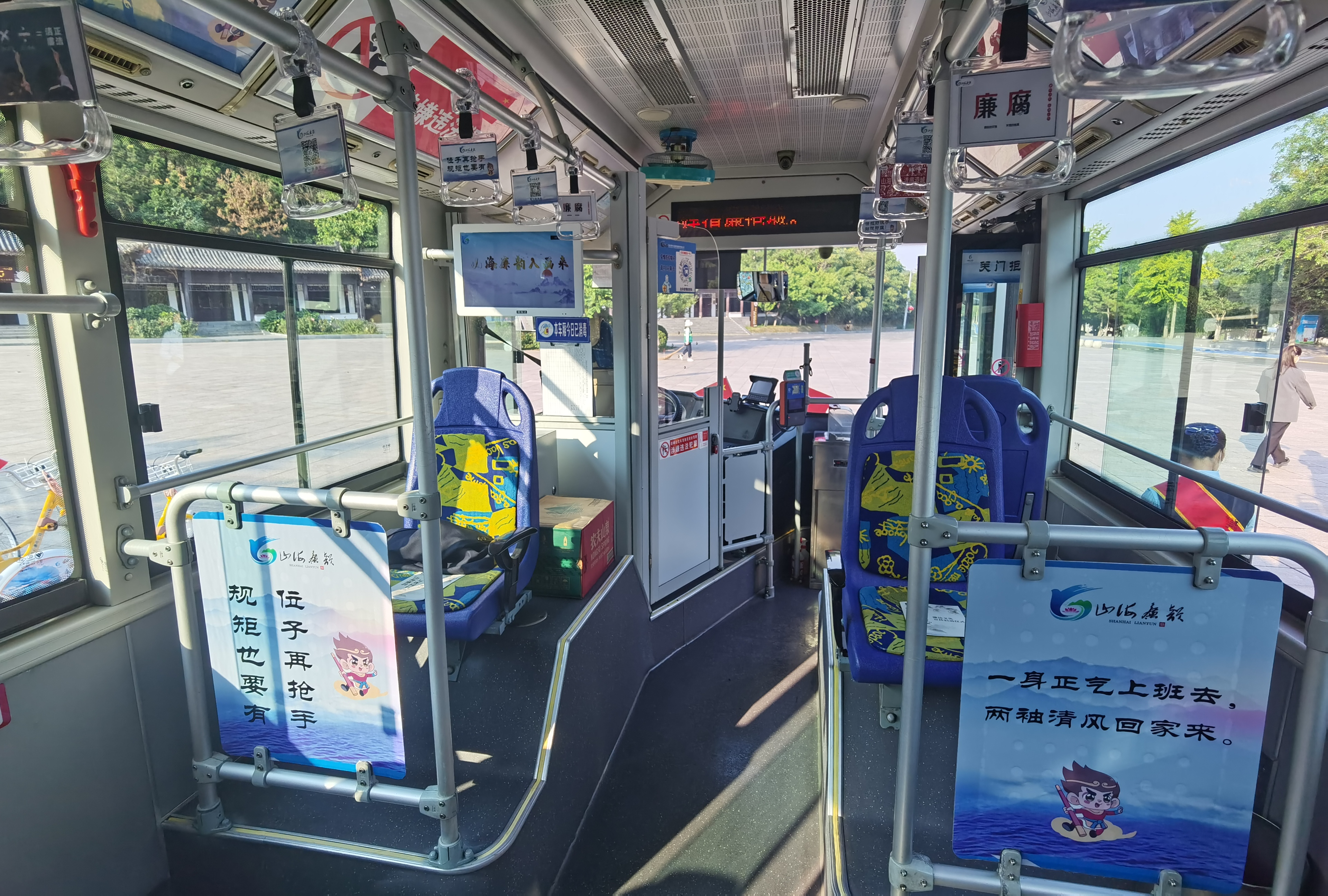 近年來,公交集團充分發(fā)揮公交行業(yè)特色優(yōu)勢,在2018年首批廉潔文化示范車15、19路的基礎上,以“山海廉韻 與連同行”廉潔文化品牌為指引,不斷加強廉潔文化平臺建設,創(chuàng)新廉潔文化載體,新增了3路、游6路廉潔文化示范車,并選取了市政府站、龍河廣場站等10個公交站臺,將“山海廉韻 與連同行”主題廉潔公益廣告、漫畫等融入站臺線路標識,形成了以公交車、公交站為窗口的立體化廉潔文化宣傳平臺。車內及線路標識上看似普通的一條條廉語、一幅幅漫畫,像春風化雨般深入人心,不斷向社會傳播清風“廉”能量,使港城獨具特色的“山海廉韻 與連同行”廉潔文化進一步得以推廣。
