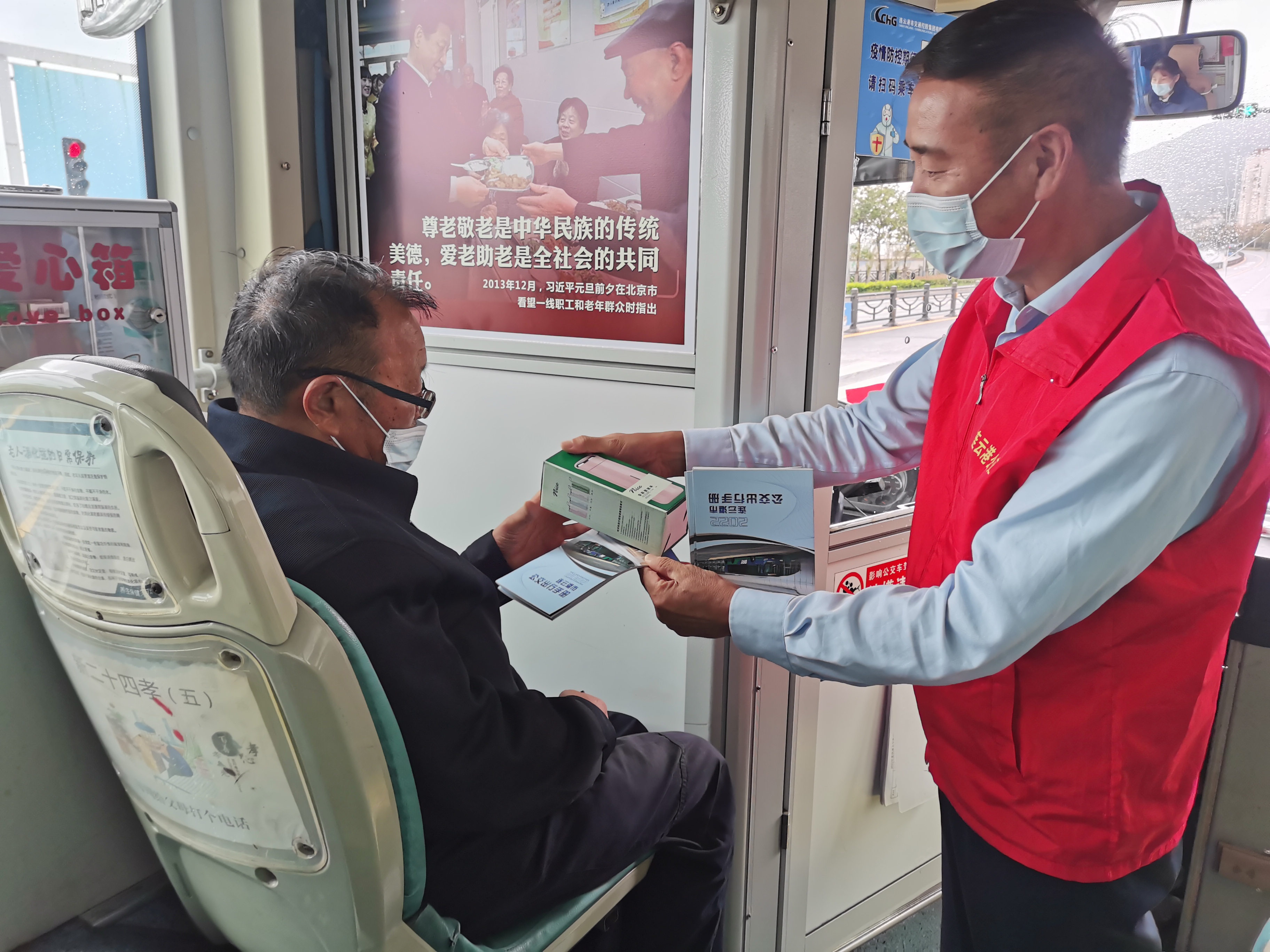 當(dāng)天志愿者們分組跟車,走進(jìn)車廂進(jìn)行疏導(dǎo)服務(wù),并送上小禮物為老年乘客送上節(jié)日的祝福。在車廂內(nèi),志愿者們講解了老年乘客乘坐公交車的注意事項;提醒乘客應(yīng)正確佩戴口罩乘車;號召和宣傳青年乘客主動為老人讓座等。當(dāng)遇到行動不便、手提重物的老人,志愿者們紛紛主動上前服務(wù),“大媽,您別著急,我扶您上車”“大爺,您別動,行李我?guī)湍谩薄盃敔?,您先別動,等車停穩(wěn)了,您再起身...”當(dāng)遇乘客問詢時,志愿者們總是耐心解答,幫助有需要的乘客上下車。在服務(wù)的同時,還聽取了老年乘客對公交的意見和建議。“老吾以及人之老”,看著一張張洋溢著幸福和充滿笑容的臉,志愿者們心里感到陣陣滿足。