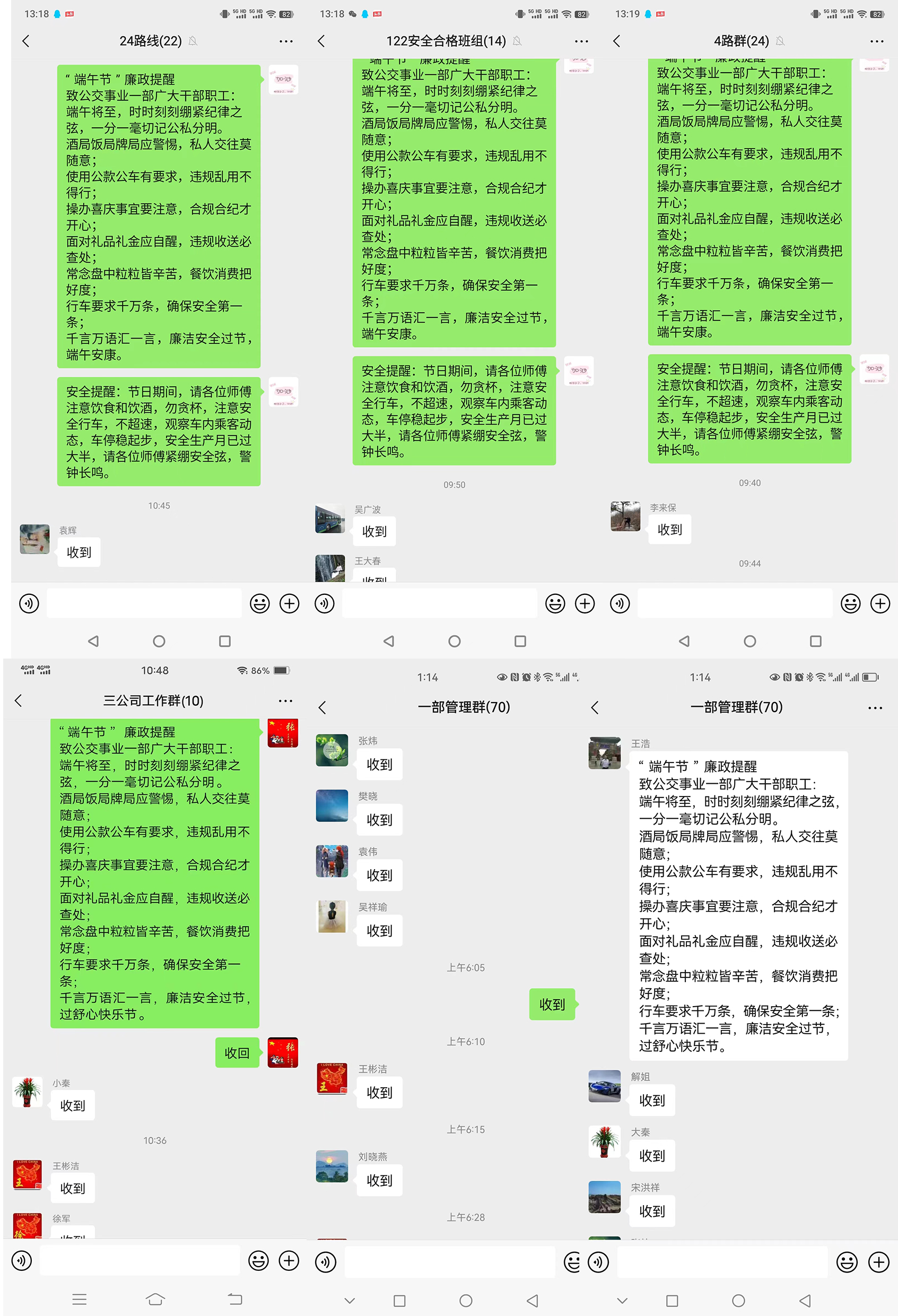 傳“廉”意,在警示提醒中筑牢思想防線。為筑牢廉政風(fēng)險(xiǎn)“防火墻”,公交事業(yè)一部采用群發(fā)微信工作群的方式,向所屬職工發(fā)送廉政微信,溫馨提醒中實(shí)現(xiàn)“廉政微信一條,警示教育一片”的良好效果。同時(shí)結(jié)合廉政文化向八小時(shí)以外延伸,向社會(huì)和家庭延伸,向黨員干部職工及轉(zhuǎn)發(fā)家屬形式開展廉政警示教育,引導(dǎo)干部職工家屬當(dāng)好“廉內(nèi)助”,常吹家庭“廉政風(fēng)”,念好家庭“廉政經(jīng)”,算好家庭“廉政賬”。