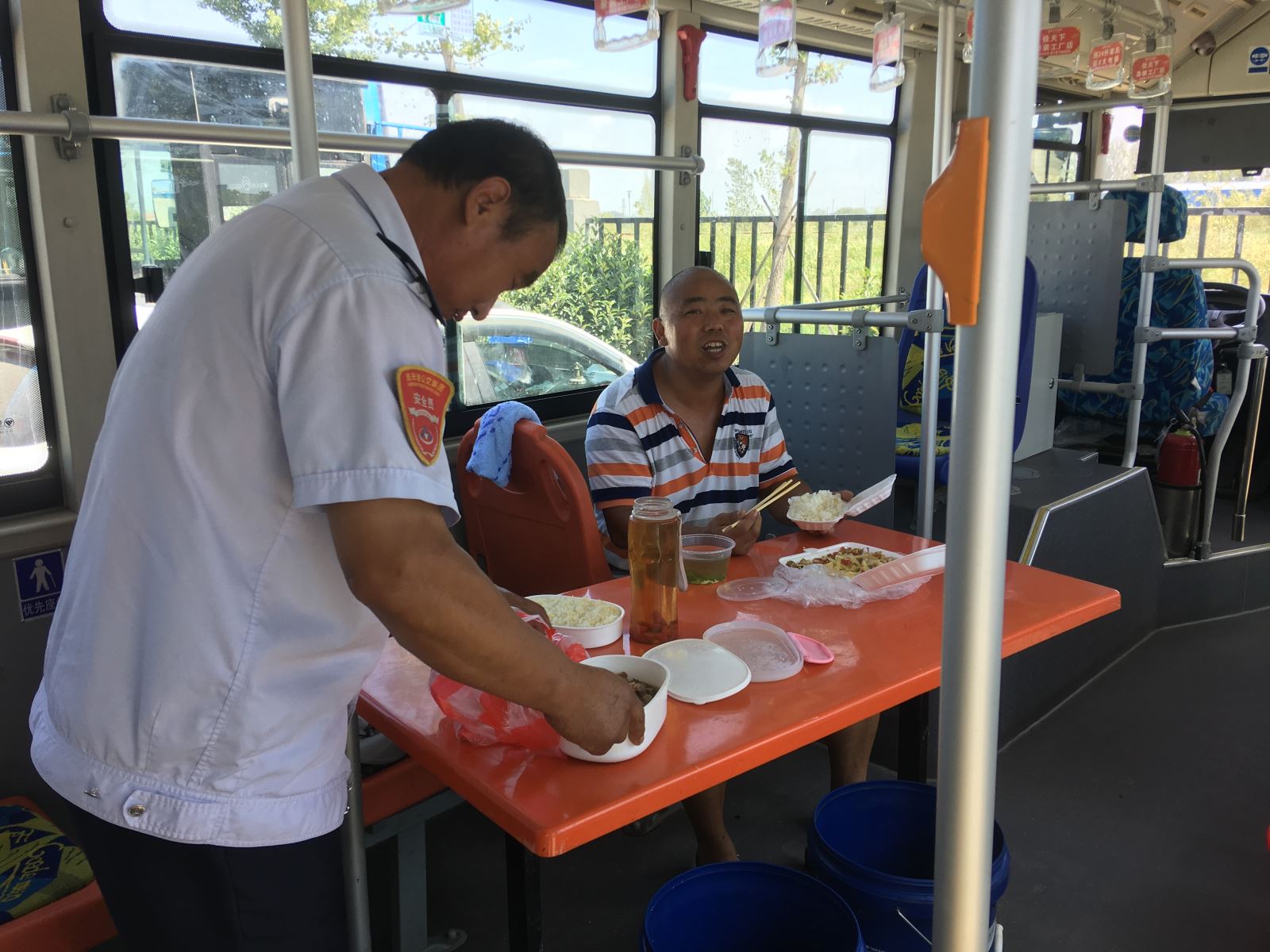 即使是在高溫天氣,為了保證市民乘客的日常出行,港城的公交人們?nèi)淌苤邷乜崾钜琅f堅(jiān)守崗位,默默地?fù)]灑著汗水。公交集團(tuán)海通公交公司為切實(shí)踐行“分公司為一線駕駛員服務(wù)”的服務(wù)理念,各分公司實(shí)行輪流值班制,在線路車輛密集的西城公交停車場,上午10:30左右,公司安排一輛電動(dòng)車停放場內(nèi),車上擺放了簡易餐桌和飲用水供駕駛員休息、吃飯使用。